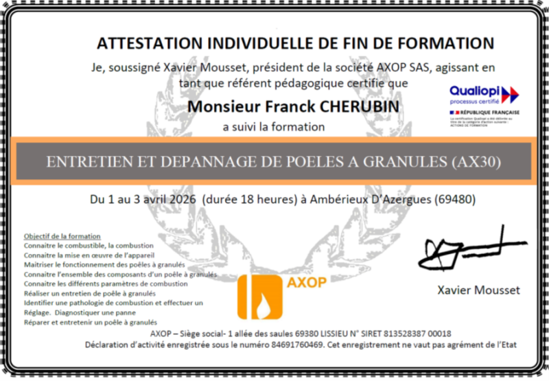 Attestation de formation sur l'entretien et le dépannage de poêles à granulés