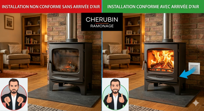 Dans les maisons modernes (RT2012, RE2020), l'étanchéité est maximale. Si vous avez une VMC (Ventilation Mécanique Contrôlée) puissante et aucune arrivée d'air spécifique pour le poêle :